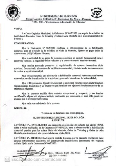 Mediante resolución municipal 044/2026 el intendente de El Bolsón, Bruno Pogliano, redujo en un 70 por ciento el canon anual para los guías de Trekking, guías de montaña y guías de alta montaña que trabajen en su jurisdicción. De esta manera, quedó en 165 mil pesos por todo el año.