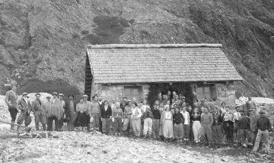 Carlos, con su pulover en V, junto a Emilio Frey y socio del CAB en abril 1955, con el refugio ampliado.
